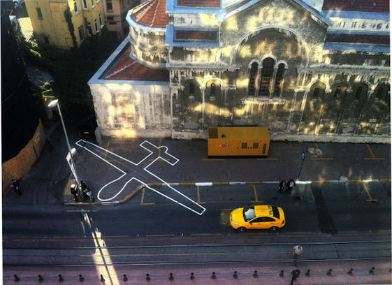 Basado en esto, Bridle realizó su primer pieza relacionada con el tame, trazando con un gis el contorno de un avión no tripulado en la calle. La sombra de un drone haciendo visible lo invisible.