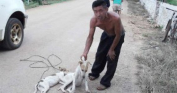 Fotografías difundidas en redes sociales muestran al hombre, a bordo de su bicicleta, arrastrando los cadáveres de dos perros ante la indiferencia de otras personas que simplemente se limitan a verlo.