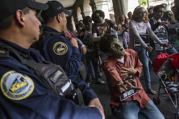 Ciudad de México, 16 de julio (SinEmbargo).– Un grupo de manifestantes disfrazados como zombies se colocaron frente al Antiguo Palacio del Ayuntamiento caracterizando diferentes afecciones como cáncer de pulmón, infarto al miocardio e infecciones respiratorias producto de la mala condición del aire en la Zona Metropolitana del Valle de México.