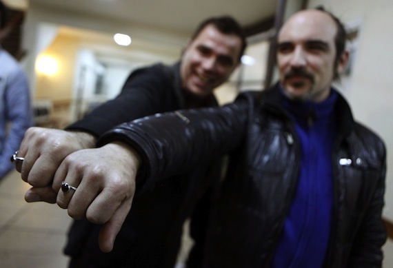 Esta boda, de la que informaron medios locales sin identificar a los contrayentes, se celebró antes que la de Sergio Miranda y Rodrigo Borda, que en la práctica fueron los primeros en iniciar el trámite pero no los primeros en casarse hoy, día en que entro en vigor la ley de matrimonio igualitario en Uruguay.