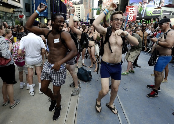 El ambiente veraniego que invade la Gran Manzana animó a muchos a quitarse la ropa, como fue el caso del colombiano Germán Rodas, quien paseaba por Times Square con unos amigos, vio el tumulto de gente en ropa interior y decidió a quitarse la camisa y los pantalones para unirse a la fiesta.