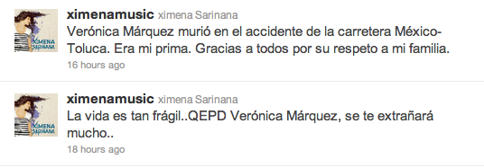 El día de ayer, la cantante Ximena Sariñana escribió en su cuenta de Twitter (@ximenamusic) que la mujer que falleció en el accidente de la carretera México-Toluca, a la altura de Santa Fe, era su prima.