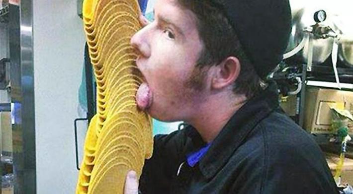 O el del empleado de Taco Bell en Irvine, California, que tuvo a bien subir a Facebook una foto de él mismo lamiendo las tortillas fritas que servirían para preparar la comida de los comensales, cuya imagen causó indignación en las redes.
