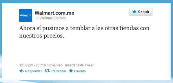 Parecido fue el caso de la cuenta de Twitter de Walmart en México, quienes tras el fuerte sismo de 7.8 grados de magnitud del 20 de marzo del 2012, tuvo a bien lanzar un mensaje con el que se adjudicaban el terremoto: