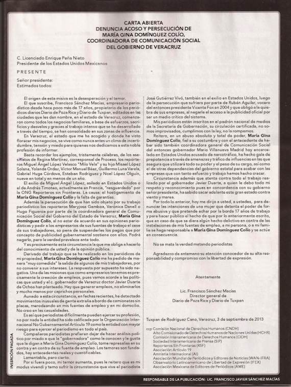 “Si se diera algún hecho delictivo en contra de las instalaciones de mis fuentes de empleo o persona o mi familia, se haga responsable a María Gina Domínguez Colio y se actué en consecuencia”, afirma el director de ambos diarios veracruzanos.