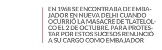 En 1968 se encontraba de embajador en Nueva Delhi cuando ocurrió la masacre de Tlatelolco el 2 de octubre. Para protestar por estos sucesos renunció a su cargo como embajador, por lo que fue evidente que tenía grandes diferencias con el gobierno de Gustavo Díaz Ordaz. Se dedicó posteriormente a la enseñanza en universidades de Estados Unidos, como las de Texas, Austin, Pittsburgh, Pensilvania y Harvard.
