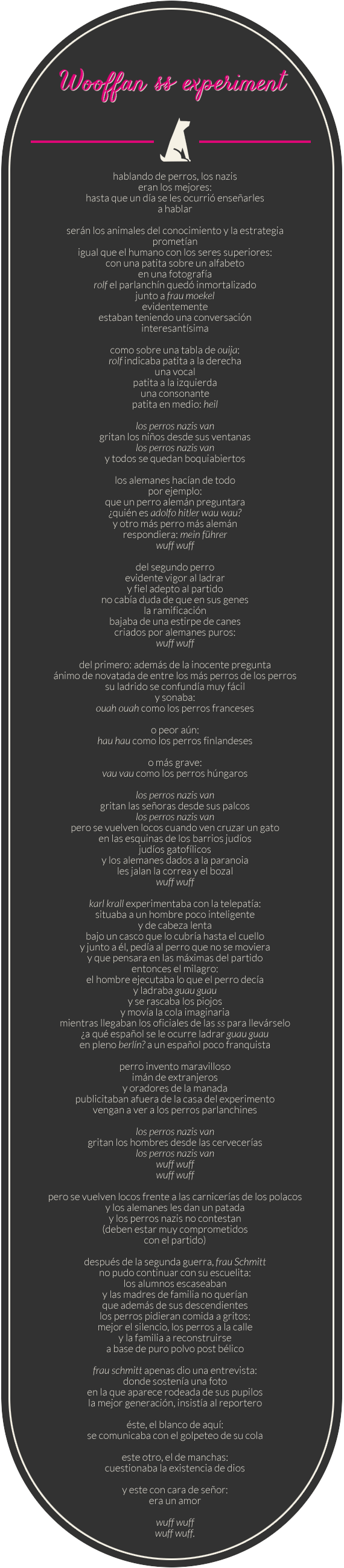 Ciudad de México, 11 octubre (SinEmbargo).- Una noticia en un periódico que hablaba del proyecto nazi de hacer hablar a los perros inspiró a Óscar David López, nacido en Monterrey en 1982, para escribir el poema “wooffan ss experiment”.