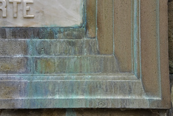 También, según la dependencia, en la parte del pedestal se presentan daños por disolución de materiales constitutivos por escurrimiento y absorción del ácido nítrico y óxidos; y manchas en la piedra por el escurrimiento y absorción de la solución del ácido nítrico.