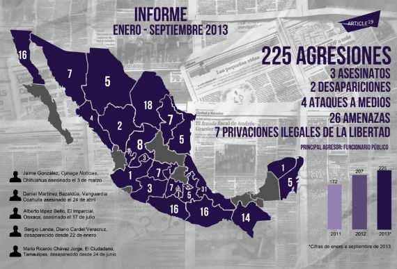 Sin embargo, en enero a septiembre de 2013, la Organización No Gubernamental (ONG) documentó un total de 225 agresiones, lo que supera al total anual de agresiones de año 2012, en el cual se registraron 207 y al total de 2011 en el que se documentaron 172 agresiones, con lo que este año se sitúa como uno de los más violentos para la prensa.