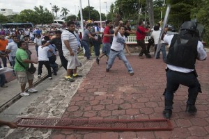 CANCÚN, QUINTANA ROO, 14OCTUBRE2013.- Maestros fueron desalojados por policías antimotines luego de que ingresaron al Palacio del Ayuntamiento a exigir un diálogo con las autoridades.