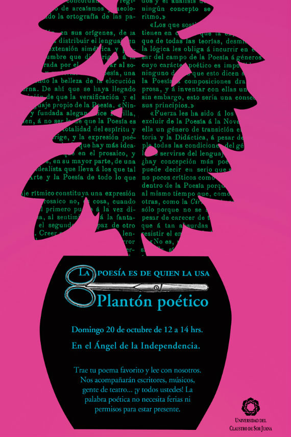 Así, la Universidad del Claustro de Sor Juana (UCSJ), a través de Vicerrectoría de Investigación y Proyectos Creativos, convoca al Plantón poético en el monumento del Ángel de la Independencia, hoy, entre las 12 y las 14 horas.