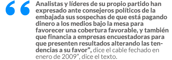 La organización fundada por Julian Assange, filtró una serie de cables que conmocionaron la vida política nacional por su relevancia. Entre los que sobresale, el reportaje de The Guardian en el que se expuso la preocupación de funcionarios estadounidenses por el supuesto pagó del entonces candidato a la Presidencia a medios de comunicación a cambio de coberturas informativas.