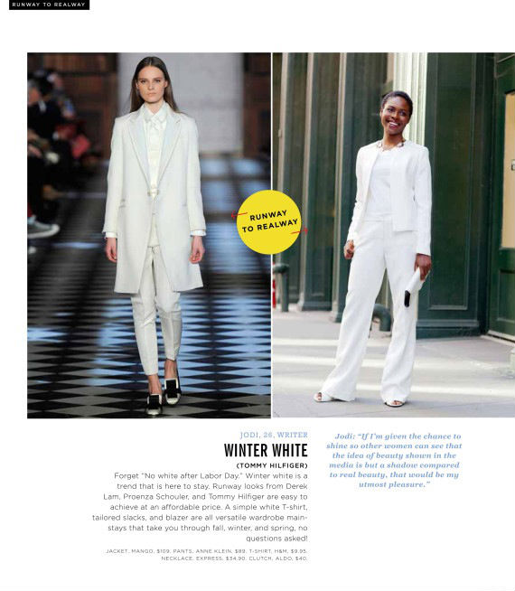 Esto se aprecia, de entrada en las imágenes de la revista, pero sobre todo en las modelos de su última edición en donde aparece un especial de moda titulado "Runway To Realway" (algo así como "De la pasarela al mundo real") en el que looks de marcas como 3.1 Phillip Lim, Tommy Hilfiger, Rochas y Miu Miu se traducen a la vida cotidiana con artículos asequibles de Zara, Mango y H&M, modelados por mujeres reales.