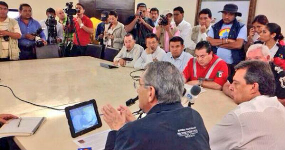 El titular de Protección Civil y el Gobernador de Guerrero en rueda de prensa. Foto:@AngelAguirreGro