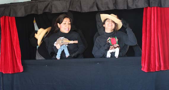 Hay que ver el rostro de los niños cuando Junny Salcedo y Cristina Montoya, dos integrantes del colectivo que realizan talleres en el ámbito psicológico y que hoy realizan su primera función de guiñol, representan la canción ranchera “Flor de Capomo”.