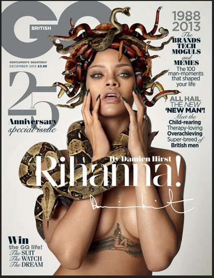 En su colaboración más reciente, la portada de la edición británica de la revista GQ se cubrió con la cantante Rihanna a modo de Medusa para celebrar su 25 aniversario.