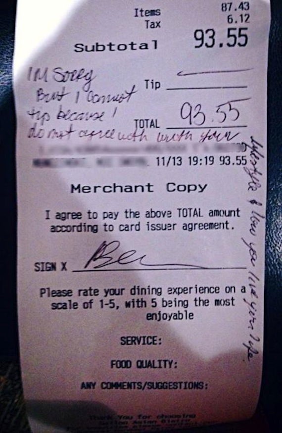 Una mesera en New Jersey, quien previamente había prestado servicios en la Marina, recibió una ofensiva nota de una familia en el restaurante que trabajaba y quien se negó a dejar propina aparentemente porque estaban molestos con su "estilo de vida gay".