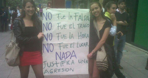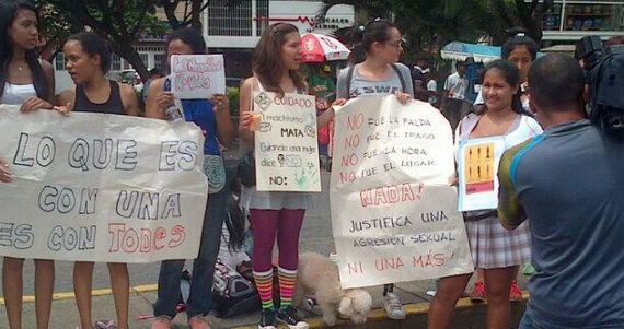Las manifestantes, que este domingo enarbolaron pancartas en la que consignaron frases contra los violadores y la violencia de género, también criticaron al dueño del establecimiento, Andrés Jaramillo, quien sugirió, en declaraciones a una emisora de radio, que la minifalda que lucía la joven que formuló la denuncia pudo incidir en la agresión sexual.