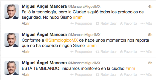 Si el "tenemosismo" de Marcelo Ebrard Casaubón se quedó como una frase para la historia de Twitter y la política mexicana, el "ESTÁ TEMBLANDO" que Miguel Ángel Mancera Espinosa, Jefe de Gobierno del Distrito Federal, escribió el pasado 25 de noviembre sólo sirvió para alarmar a la población...en vano.