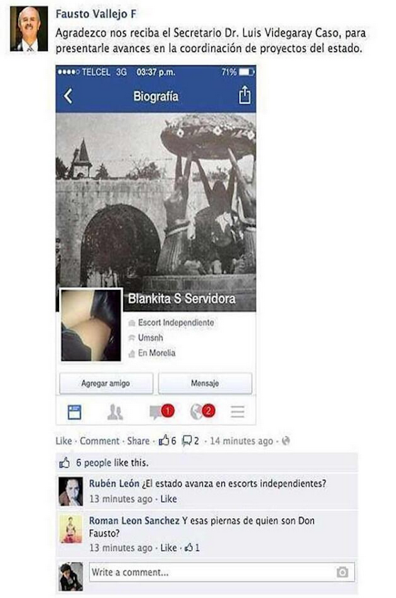 Por descuido del encargado de las redes sociales del Gobernador de Michoacán, Fausto Vallejo Figueroa, en la página oficial del mandatario en Facebook se publicó el perfil de un sexoservidora, hecho que generó críticas y burlas entre los usuarios.