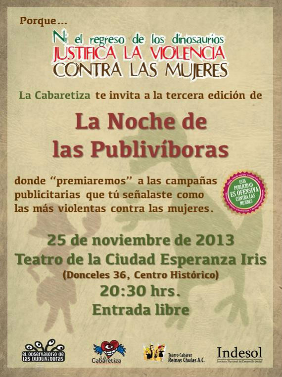 “La publicidad no sólo nos vende productos, también nos vende estereotipos y prejuicios. Se lo proponga o no, la publicidad sexista y discriminadora legitima la creciente violencia que hoy enfrentamos las mujeres y la impunidad que rodea este fenómeno en nuestro país. Porque si las mujeres son banales y son objetos, ¿qué más da que se abuse de ellas?”, afirman los organizadores. Lo que Las publivíboras