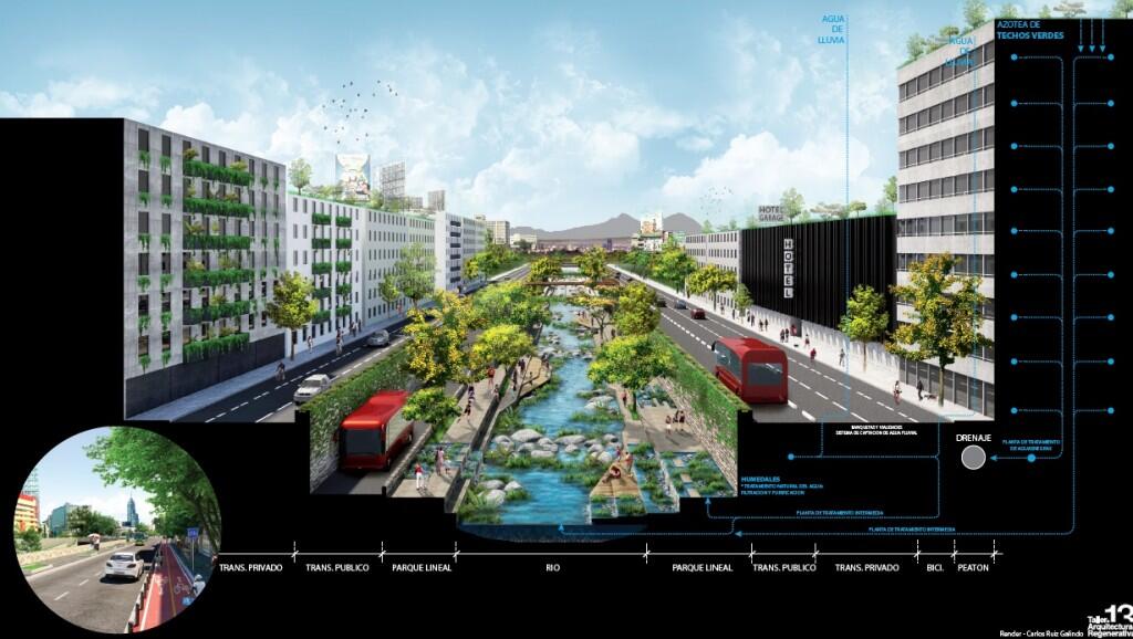 De esa manera se podría crear un corredor sustentable que además de mejorar la imagen de la ciudad optimizaría los espacios recreativos, y de transporte público y privado, además del ecosistema perdido, como se puede ver en la imagen de arriba.