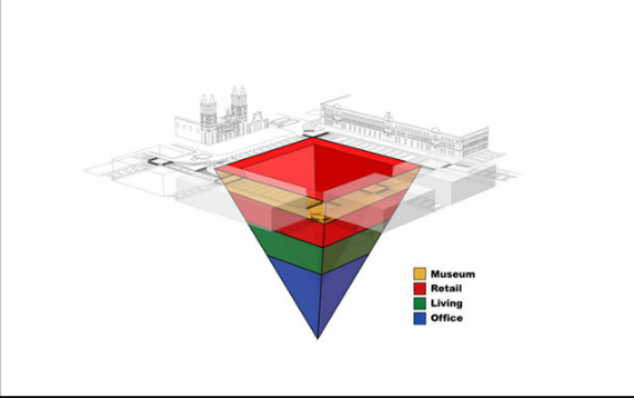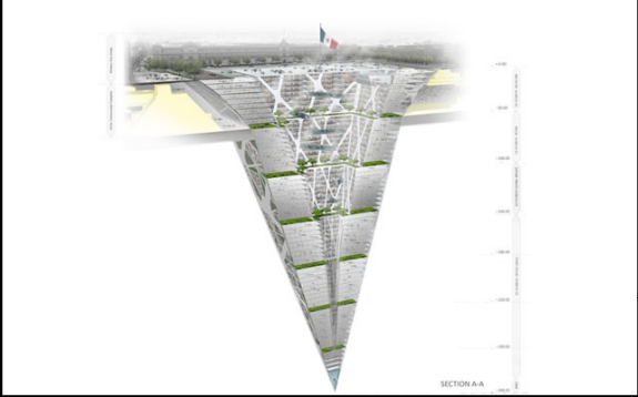 El edificio con forma de pirámide invertida consta de 65 pisos, 10 de ellos que permitirán una superficie suficiente para que pasen los rayos del sol y además servirán como un museo en el que se exhiban aquellos vestigios encontrados durante la construcción; los siguientes 10 niveles se utilizarán para locales comerciales; la decena posterior para viviendas y los 35 pisos alojados casi 300 metros por debajo del nivel de banqueta cumplirán la función de oficinas.