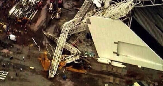Una grúa golpeó una parte del techo del estadio, lo que provocó que su derrumbara y afectó a las gradas situadas debajo. Los bomberos detallaron a Efe que la parte de la cobertura que se desmoronó tenía una longitud de unos 15 metros.
