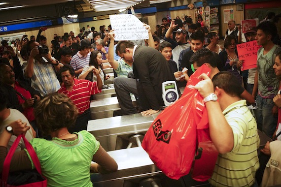 A las 14:00 horas comenzó la protesta contra el aumento a la tarifa del boleto del Sistema de Transporte Colectivo y los inconformes anunciaron que no hay un horario definido para su conclusión, además de que esperan repetir esta acción en otras estaciones como Hidalgo, Pantitlán y Balderas.