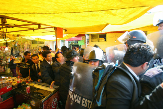Los policías armaron un cerco y enseguida llegó un pequeño grupo de al menos 5 jóvenes, de los cuales se deslindaron los manifestantes, y comenzaron a pelear con los policías, aventándoles cosas que se habían robado de un puesto cercano.