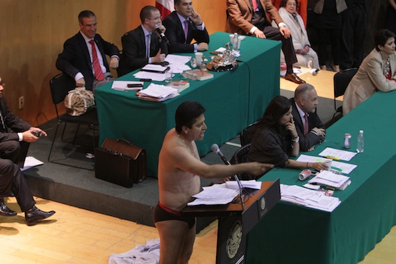 En el Auditorio "Aurora Jiménez Palacios" del Edificio E de este recinto legislativo y ante las críticas de los diputados presentes argumentó que no le daba vergüenza desnudarse, al momento que se despojaba de la ropa.