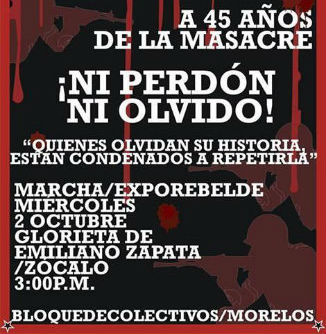 Era el 45 aniversario de la matanza de Tlatelolco. Profesores y alumnos de al menos 7 estados del país, tomaron las calles para conmemorar a los estudiantes muertos en 1968. La tensión por lo menos en el DF se incrementó con los referentes de la represión, detenciones arbitrarias y  agresiones que se manejaron en las marchas del año.