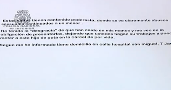"Estas cintas tienen contenido pederasta, donde se ve claramente abusos sexuales continuados a un menor. He tenido la 'desgracia' de que han caído en mis manos y me veo en la obligación de presentarlas dejando que ustedes hagan su trabajo y puedan meter a este hijo de puta en la cárcel de por vida. Según me he informado tiene domicilio en calle hospital san miguel, 7 Jaén", dice la carta que es difundida por el diario español El País.