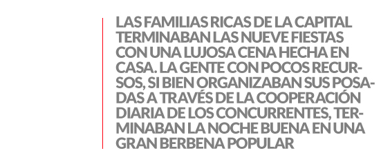 Nadie quedaba al margen de la diversión. Las familias ricas de la capital terminaban las nueve fiestas con una lujosa cena hecha en casa. La gente con pocos recursos, si bien organizaban sus posadas a través de la cooperación diaria de los concurrentes, terminaban la Noche Buena en una gran berbena popular, que se realizaba en el Zócalo, después de haber escuchado la famosa misa de gallo y saborear los buñuelos, naranjas, dulces, pulque y demás colación.