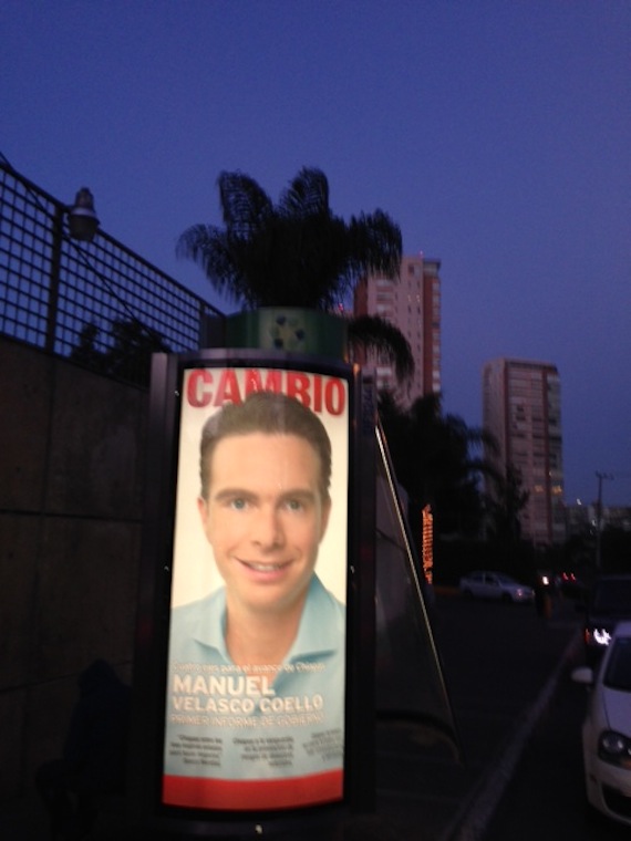 A mediados de diciembre pasado algunos camiones de transporte de pasajeros que diariamente circulan por el Distrito Federal mostraban en su publicidad anuncios que cubrían la parte de atrás o de alguno de los lados, con el rostro de Manuel Velasco Coello.