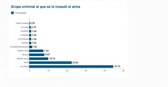 De acuerdo con el análisis de una base de datos de dos mil 921 registros de armas incautadas en México durante 2006-2010, filtrada por la Oficina para el Control del Alcohol, Tabaco y Armas de Fuego (ATF) y a la cual las organizaciones Fellowship of Reconciliation (FOR) y el Movimiento por la Paz con Justicia y Dignidad (MPJD) tuvieron acceso, 44.79 por ciento fueron aseguradas al grupo criminal de Los Zetas; 22.66, al cartel del Golfo; 10.16, a los Beltrán Leyva; 8.0, al cartel de Sinaloa y 7.75, a los Arrellano Félix.