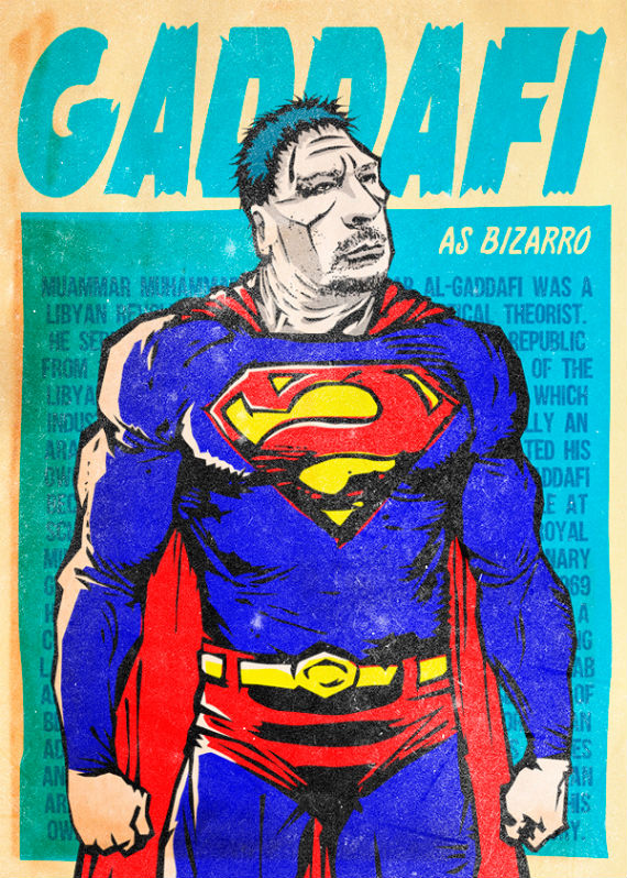 Muamar Gadafi, el dictador que gobernó Libia por más de 40 años, se ve representado en la versión "bizarra" de Superman, mientras que el führer, Adolfo Hitler muestra sus reconocibles ojos y bigote dentro del casco de Galactus, el villano que necesita "comer mundos" para saciar su hambre.