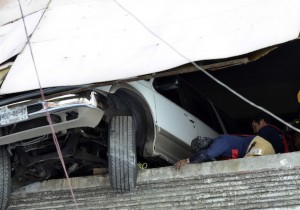 MÉXICO, D.F., 13FEBRERO2014.- Una camioneta quedó “volando” en el segundo piso de un estacionamiento ubicado en el eje 1 Norte esquina con Argentina, en el Barrio de Tepito.