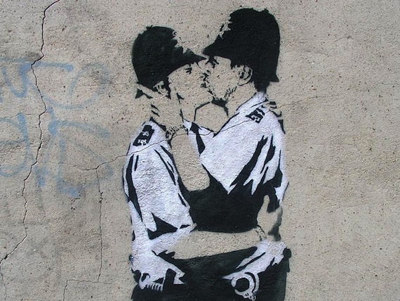 La icónica obra de Banksy en blanco y negro, en la que aparecen dos policías británicos besándose, fue adquirida este martes por un comprador anónimo.
