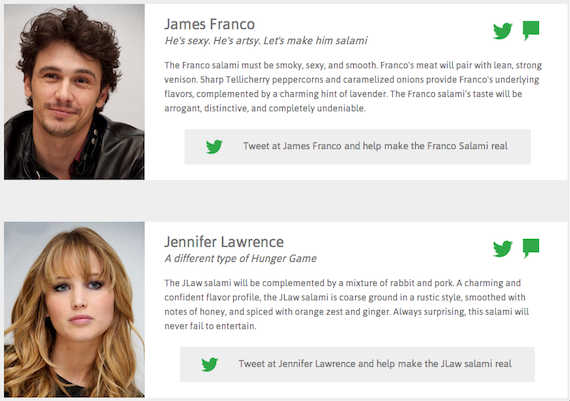 Mientras tanto, cualquier interesado en el proyecto puede entrar al sitio web para votar por su celebridad favorita. No obstante, el repertorio es limitado, y sólo se puede elegir entre James Franco, Jennifer Lawrence, Kanye West y Ellen DeGeneres. En caso de que uno de ellos sea del agrado del internauta, lo único que éste tiene que hacer es tuitear el nombre de su elección con la etiqueta #EatCelebrityMeat (come carne de celebridad).