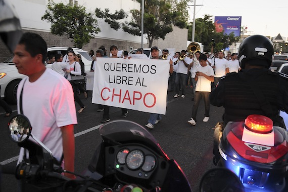 A la marcha de Culiacán se unieron cientos de personas que con carteles, bandas musicales y playeras con el rostro del capo, expresaron su apoyo al narcotraficante detenido en el penal de alta seguridad del Altiplano, en el Estado de México. Algunas leyendas decían: “Arriba ‘El Chapo’”, “Te quiero Chapo”, “Liberen al Chapo”.