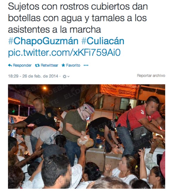 Por su parte, el diario El Debate, publicó a través de su cuenta de twitter una fotografía donde sujetos, algunos con los rostros cubiertos, repartían tamales ya agua a los asistentes a la marcha a favor del narcotraficante.