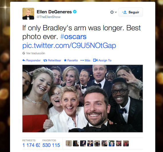 Los Ángeles (EU), 2 mar (EFE).- En menos de 50 minutos, el "selfie" o autofoto realizado por Ellen Degeneres rodeada de estrellas de Hollywood como Meryl Streep, Brad Pitt, Angelina Jolie o Julia Roberts en la ceremonia de los Óscar se ha convertido en la más retuiteada de la historia, superando el millón de retuits.