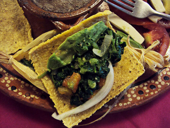 Platos que van desde gualumbos (flores) con escamoles, nopales, chicharas de encino, fríjol quebrado con hoja de aguacate, tamales de chinicuil (gusano) con flor de sábila, y otros más exóticos como la ardilla horneada, cascabel asada, armadillo al ximbó (penca de maguey) y otras delicias poco convencionales.