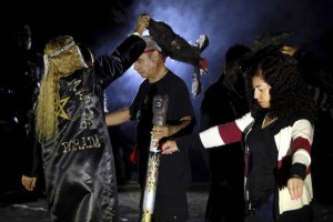 CATEMACO, VERACRUZ., 07MARZO2014.- Brujos, hechiceros y shamanes iniciaron las festividades del Día de Brujos, este primer viernes de marzo, con un ritual satánico y misa negra que se realizó fuera del programa estipulado por las autoridades municipales y estatales. Los hombres y mujeres acudieron a un espacio de veneración ubicado en la colonia popular "El Paraíso", en donde invocaron a Satanás por más de una hora y media durante la madrugada del viernes. Cabe resaltar que los participantes sacrificaron cinco gallinas negras y un cordero, el cual ofreció abundante sangre para que pudieran untarse en las manos y el rostro. FOTO: FÉLIX MÁRQUEZ / CUARTOSCURO.COM