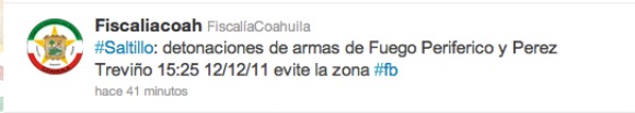 Alrededor de las 15:25, la Fiscalía de Coahuila, a través de su cuenta en Twitter, reportó detonaciones de armas de fuego en Periférico Luis Echeverría y Pérez Treviño y pidió no acercarse a la zona.