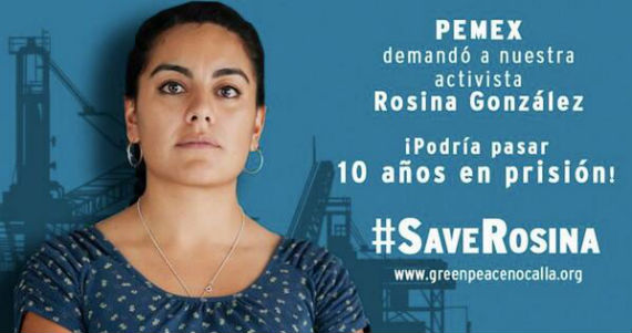 Ciudad de México, 5 de abril (SinEmbargo).- La organización ambientalista Greenpeace denunció que la activista Rosina González podría pasar 10 años en prisión, pues la empresa paraestatal Petróleos Mexicanos (Pemex) la acusa de haber dañado una lámpara con valor de 78 mil pesos.