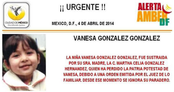 Ciudad de México, 5 de abril (SinEmbargo).- La Procuraduría General de Justicia del Distrito Federal (PGJDF) activó la Alerta Amber para localizar a la niña Vanesa González González, de tres años de edad, quien fue sustraída por su madre el pasado 4 de diciembre.