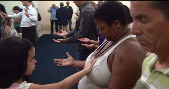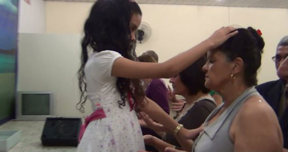 "Cuando la pequeña misionera te toque, algo pasará. Te curará", dice el padre de Alani como introducción a su performance milagroso que tiene como número principal el exorcismo, una práctica que tiene una gran presencia en la vida cristiana de las zonas más pobres de Brasil.