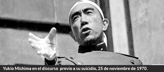 Mishima extrajo la joya de sable, deseaba mostrarla al general Kanetoshi Mashita, comandante del cuartel. Dejaron pasar a los cinco hombres. Sentado en su despacho, el general Mashita observaba con detenimiento el sable. Fue amagado y sometido a las órdenes de Mishima. El discurso de éste frente a las tropas clamando por el espíritu bushi (samurái) se escuchaba trasnochado. Los soldados no lo bajaban de payaso, pedían que nos les quitara más el tiempo. Nadie tenía fe en la vía del samurái ni en el honor que supondría cometer seppuku. Nadie excepto este escritor. Ninguno se abría ya en canal exclamando: “¡Tennō Heika Banzai! o “¡Larga vida al Emperador!”.
